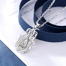 An intricate Evil Eye, Lotus Flower, and Hamsa Hand themed silver pendant and necklace.